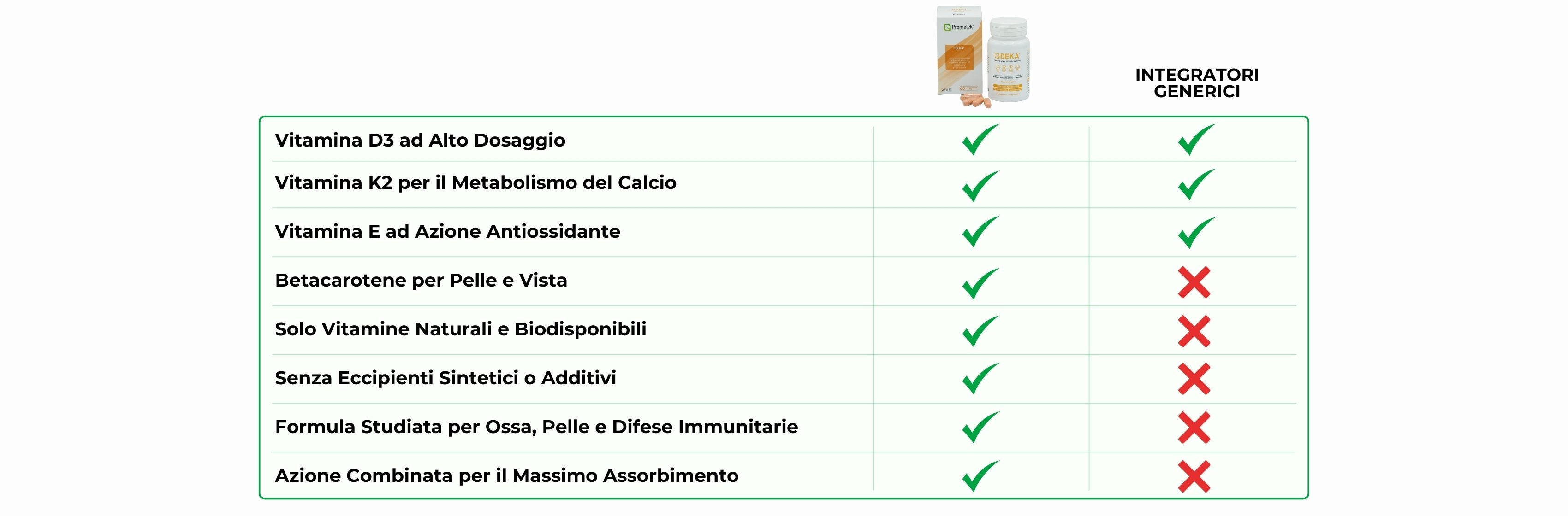 DEKA è diverso. La nostra formula utilizza solo vitamine naturali e altamente biodisponibili, bilanciate per garantire un assorbimento ottimale e un’azione sinergica. Altri integratori possono sembrare simili, ma senza la giusta combinazione di nutrienti, non offrono gli stessi benefici reali.